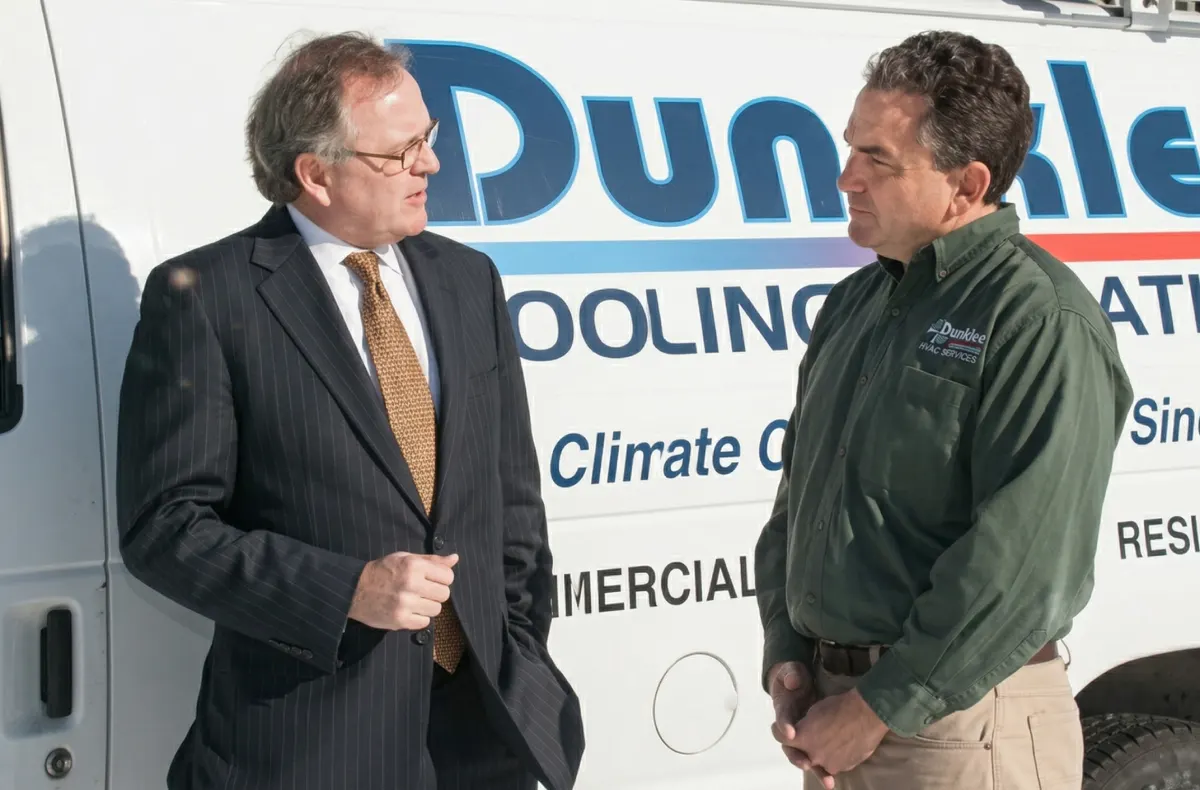 Senator Maynard with Jonathan Duncklee, owner of Duncklee Cooling & Heating in Stonington, has long felt that people need to make an effort every day to be environmentally conscious. He recently partnered with Brian Bonner of Bonner Electric in Norwich to back up that sentiment, and install solar panels on his business’s roof. I visited his business to check them out and talk about the state program that incentivized him to “go green.”
